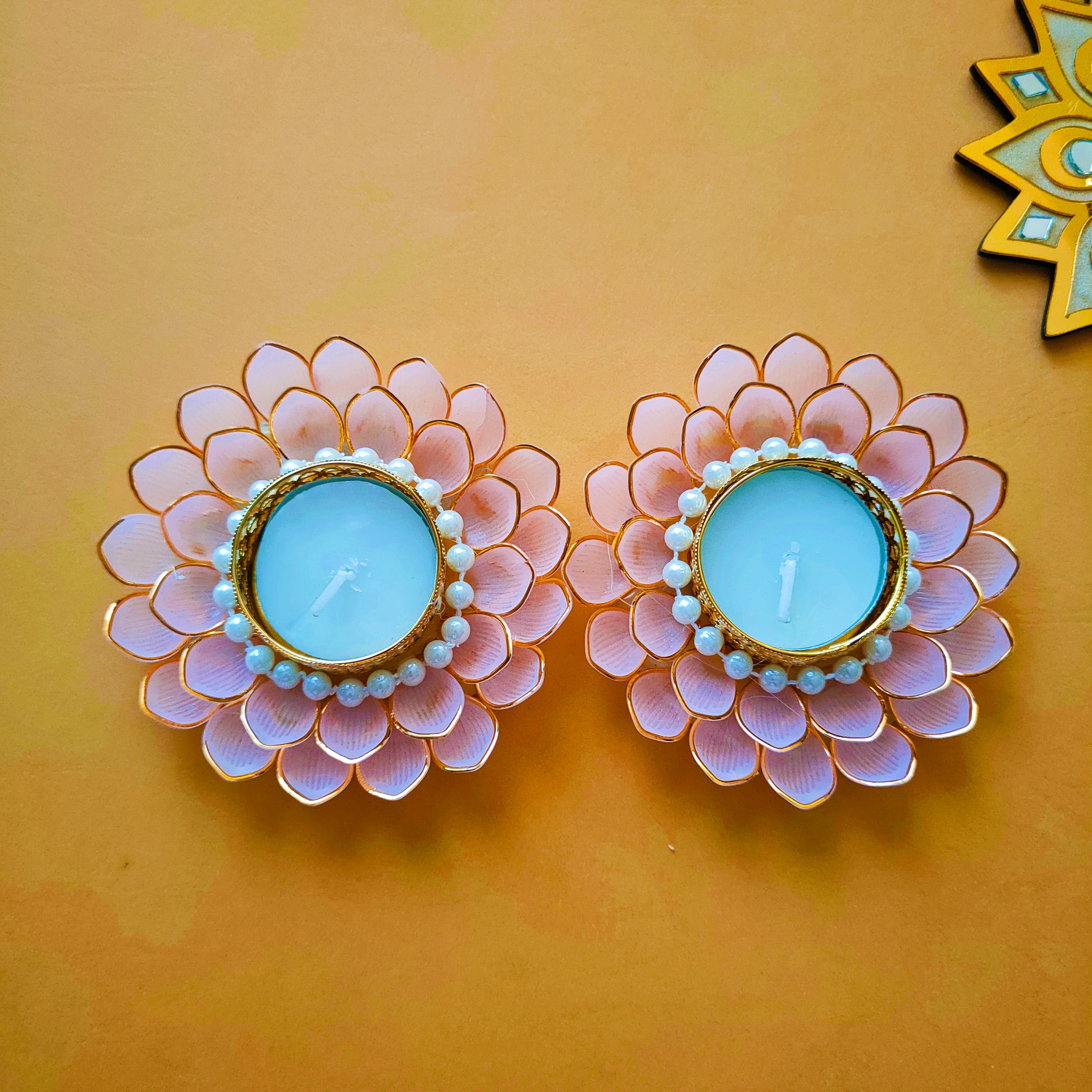 Illuminate your celebrations with the soft elegance of our Blush Petal Pearl Diyas. Handcrafted with layers of delicate pink petals outlined in gold, each diya cradles a shimmering tealight at its heart, framed with a ring of lustrous pearls. The design captures the charm of a blooming lotus — a symbol of purity and festivity.